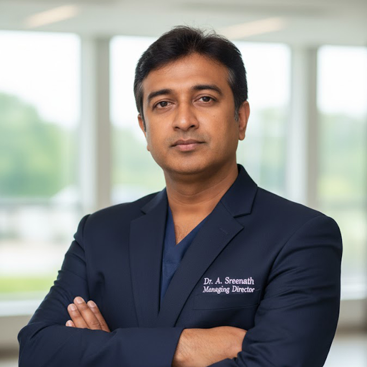 Dr. A. Sreenath M.D. (DNB) M.S.P. (Sweden) F. C. G. P., F.C.D. Family Physician & Diabetologist over 20 years of leadership experience in the medical and healthcare sector, with a strong background in hospital management, healthcare innovation, and patient-centred care. Throughout his career, he has been instrumental in driving quality healthcare delivery, operational efficiency, and strategic growth across various healthcare institutions. With a clear vision to enhance access to quality healthcare, promote medical excellence, and embrace digital health technologies, he is leading the organization toward a future focused on innovation, compassion, and community well-being.